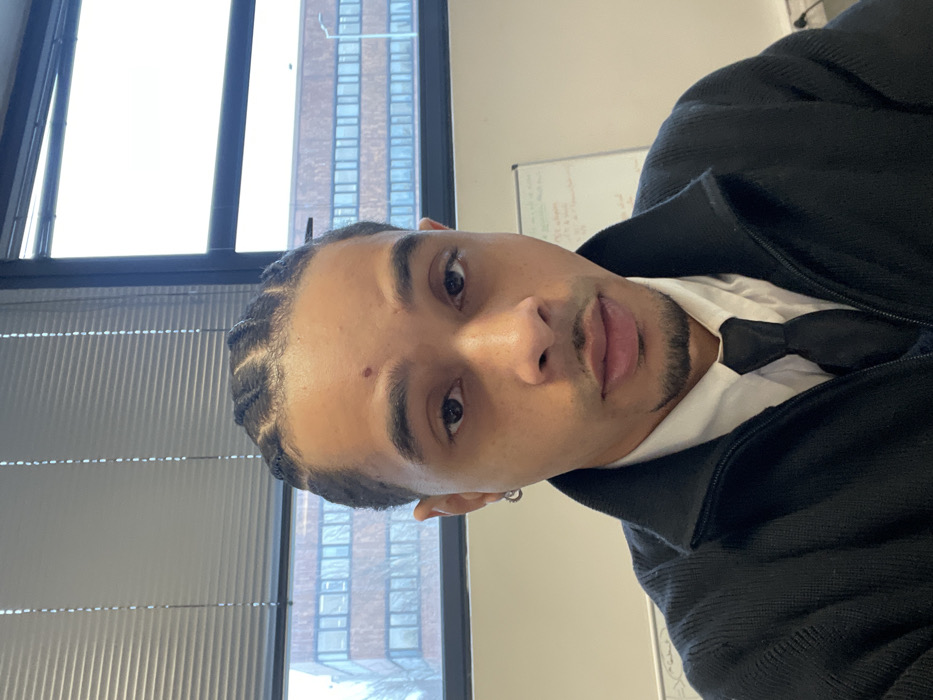 A man with braided hair, a white shirt, and a black tie poses indoors near a window with blinds. He wears a black jacket. A building is visible through the window. The lighting is bright. The man looks directly at the camera. A whiteboard with writing is visible in the background. He has a small mole on his forehead.