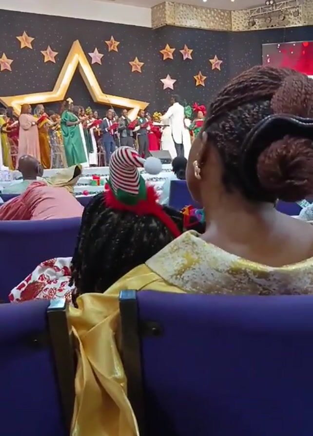 The video captures an indoor scene of a church, where a choir of approximately 20 people is performing on a stage decorated with a large golden star and several smaller star-shaped lights against a black background