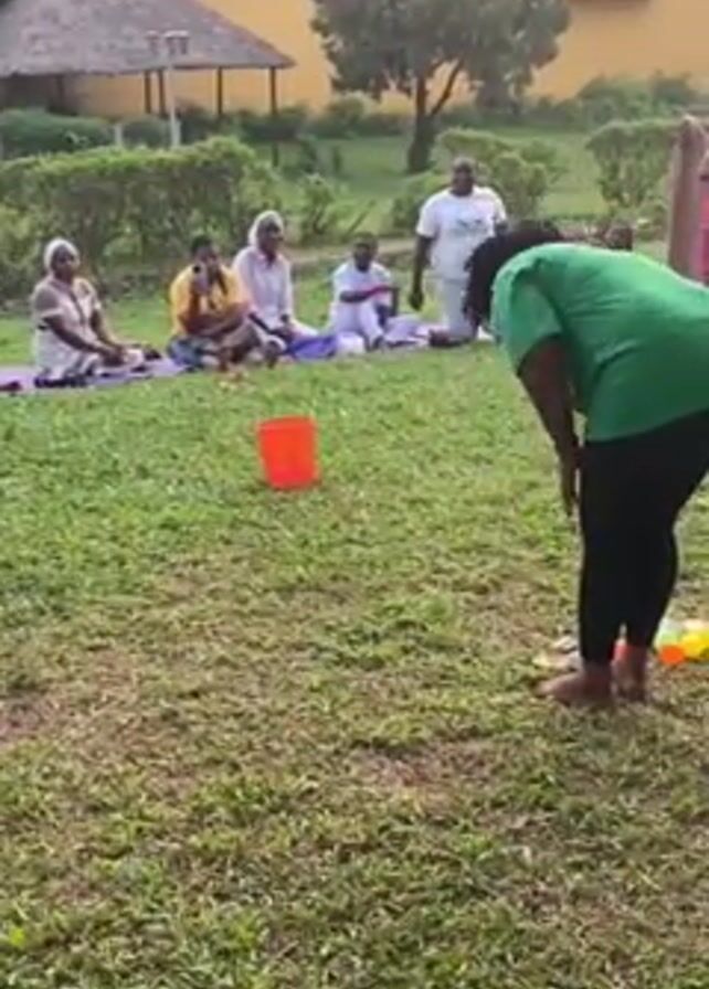 A woman in a green shirt and black pants stands on grass, facing away from the camera and bending over. In front of her are several colorful plastic objects. An orange bucket sits in the grass a few feet away. Behind her, several women are sitting on the grass on blankets. Some of the women are wearing white head coverings. A few are talking or gesturing with their hands. In the background is a building with a yellow facade, a small hut with a thatched roof, and several trees. The scene appears to be outdoors, possibly in a park or courtyard.