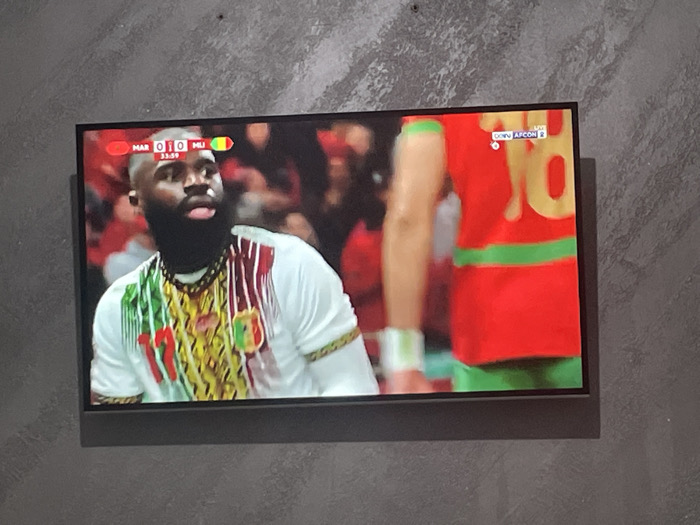 A television displays a soccer game between Morocco (MAR) and Mali (MLI), with a score of 0-0 at 33:59