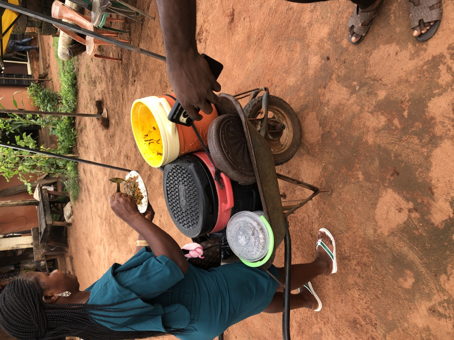 An outdoor scene in Awka, Nigeria, depicts a woman serving food from a mobile stall