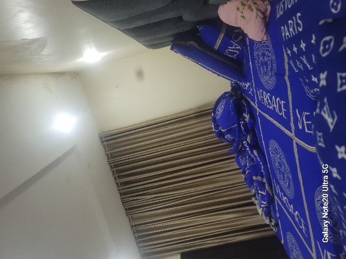 A blue Versace and Louis Vuitton-patterned blanket sits on a gray couch. Behind the couch, horizontal blinds cover a window, with an overhead light fixture illuminating a white wall. The blanket's design features repeating Versace Medusa heads and Louis Vuitton logos, separated by gold lines. The camera used to capture the image is identified at the bottom right as a "Galaxy Note20 Ultra 5G."