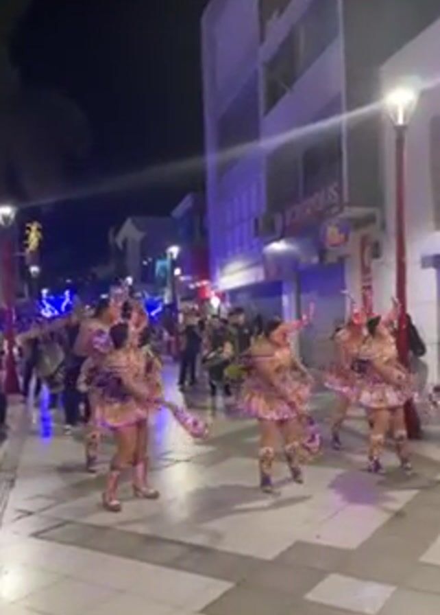 dance group performing on a pedestrian street at night. The dancers are women dressed in elaborately decorated costumes in shades of purple, gold, and white. The costumes include headdresses with horn-like structures and masks. They are performing synchronized dance moves. Behind the dancers is a band, including drummers, playing music. The street is well-lit with streetlights and festive lighting. People are watching the performance from the sides of the street. Buildings line the street, and a sign for "ACROPOLIS" is visible.