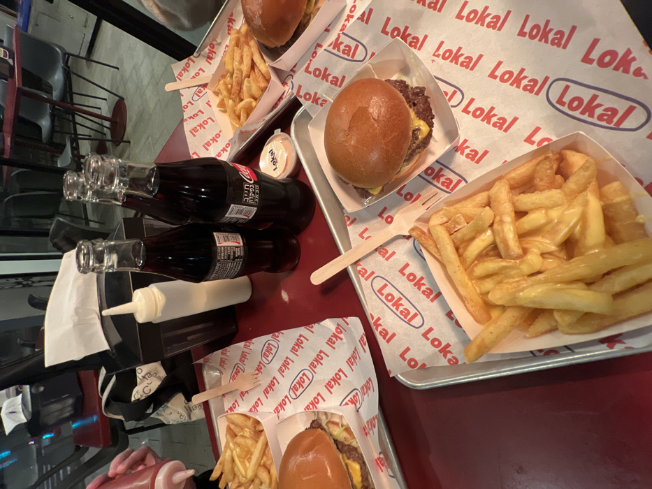 The image displays a red tabletop at a Lokal restaurant in Tel-Aviv, Israel, laden with food. Three individual meals are visible, each comprising a cheeseburger in a small white paper container and a serving of french fries in a separate white paper tray. All food items rest on white paper liners printed with the "Lokal" brand logo. Some french fries are partially covered with a yellow cheese sauce. Three glass bottles of Coca-Cola, featuring Hebrew text including "מיוצר בישראל" (Made in Israel), are centrally placed. To the left, a clear plastic squeeze bottle containing a white condiment and a black napkin dispenser holding white paper napkins are present. A hand is partially visible in the upper left, holding a red plastic squeeze bottle, presumed to contain ketchup. Small wooden eating utensils are positioned next to some of the food trays. The background shows blurred red tables and dark chairs, indicating an indoor dining establishment.