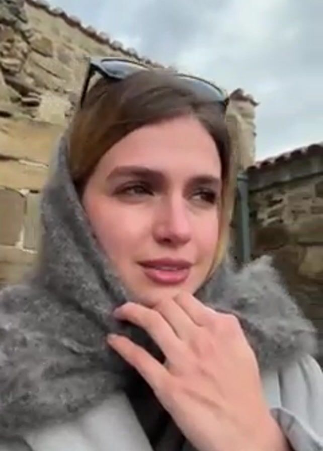 A woman in a gray scarf and coat is standing outside. She touches her face and looks around. In the background is a stone building, a river, and mountains. It appears to be a windy day.