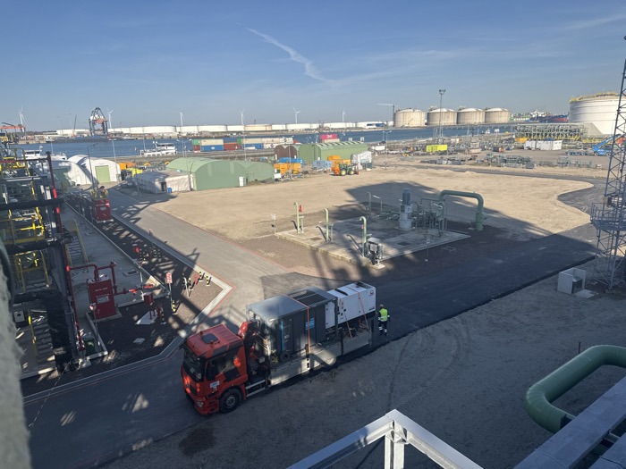 The image depicts an industrial port facility in Maasvlakte, Rotterdam, Netherlands, under clear blue skies with a single contrail