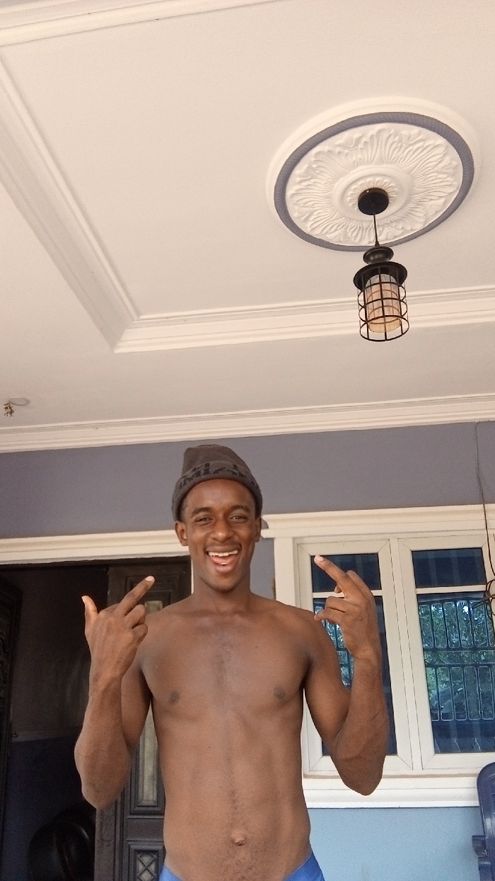 A single adult male subject stands centrally within what appears to be an interior or covered exterior space in Agburu Uke, Nigeria. The individual, of dark complexion, is shirtless and wears blue swim briefs, along with a dark beanie cap displaying light text or patterning. He smiles broadly, mouth open, and extends the index and middle fingers of both hands in a 'V' gesture, positioned approximately mid-torso level. The overhead environment consists of a white ceiling featuring rectangular molding and a decorative circular medallion, from which a black, caged lantern-style light fixture hangs. A muted blue-grey wall forms the immediate background. To the right of the subject, a white-framed multi-pane window with dark security bars reveals exterior greenery. To the left, a section of a dark paneled door is visible. A fragment of a blue plastic chair is present at the far right edge of the frame.