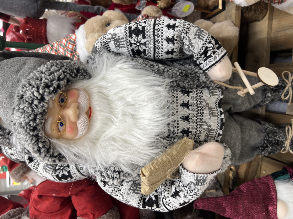 The image displays a large Santa Claus figurine in a retail setting in Mondeville, France. The figure wears a grey knit sweater featuring white and black fair-isle patterns with trees and reindeer, grey pants, and a grey hat with a fuzzy grey trim. Its face is pale pink with rosy cheeks, a white mustache, a long white beard, blue eyes, and gold-rimmed glasses. In its left arm, it holds a rectangular package wrapped in burlap and secured with twine. Its right hand holds a small wooden pull-toy consisting of a circular base on an axle with a handle, attached by a string. The Santa's grey boots have fuzzy cuffs and are tied with twine. The background, out of focus, shows other Christmas decorations, including a red-clad figure, a gnome with a red sparkly hat, and a teddy bear wearing a red and green plaid hat.