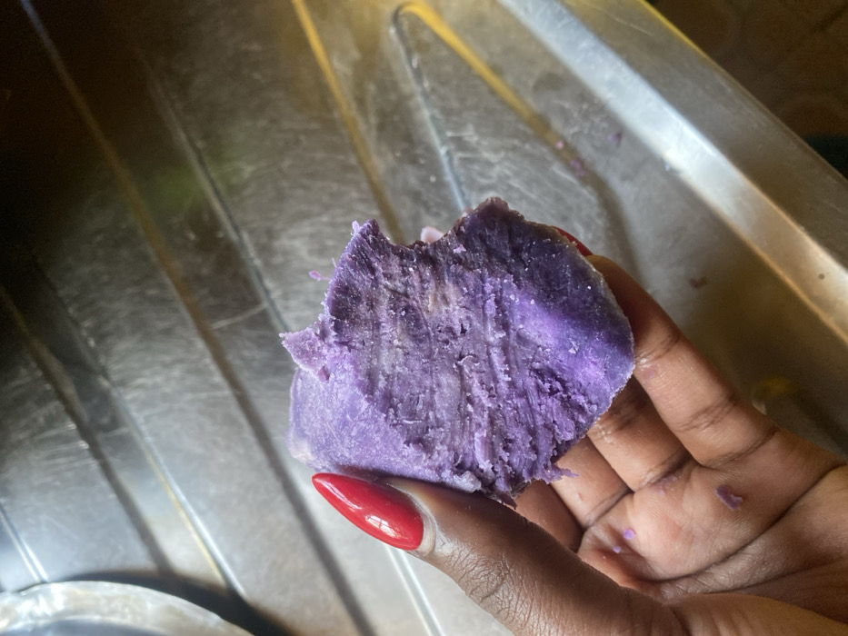 In Kianyaga, Kenya, a dark-skinned left hand with a long, pointed, bright red polished fingernail on the thumb holds a irregularly shaped piece of purple root vegetable, consistent with a cooked purple sweet potato or yam