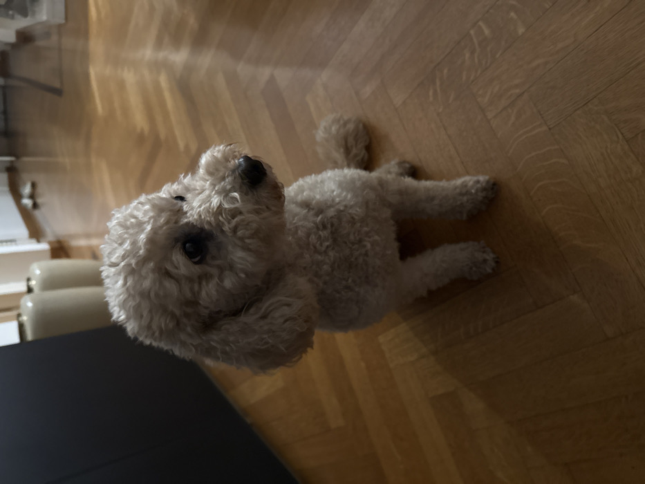 - "The image displays a light beige or cream-colored Poodle-type dog, characterized by its curly fur, dark eyes, and dark nose" by FM-NL03L2, licensed under CC BY 4.0