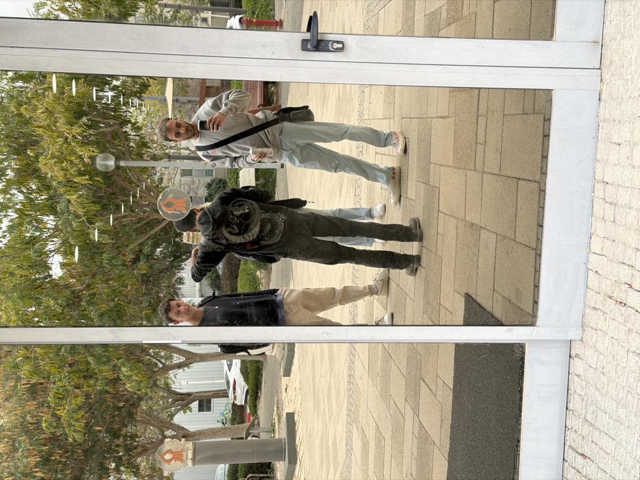 Three people are reflected in a window. The first person wears a grey sweatshirt, light blue jeans, and a crossbody bag, holding a phone. The second person is in all black with a jacket and a graphic on the back. The third person is in a black jacket and beige pants. Outside the window, trees, a lamppost with an emblem, and a parking lot are visible. The window frame is white with a black handle. Paving stones are reflected on the ground.