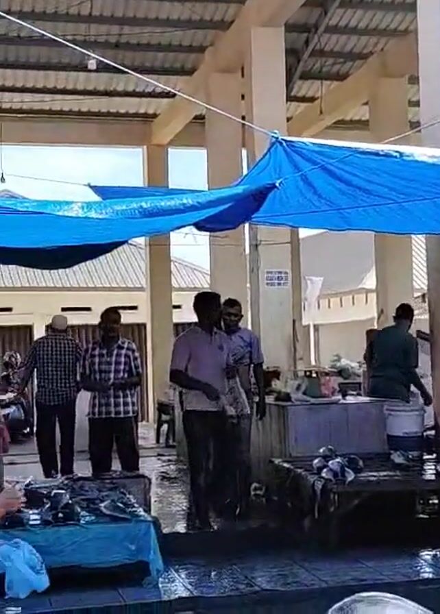 The video depicts a bustling outdoor market setting. Numerous individuals are visible, some standing and observing, others actively engaged in activities related to the stalls. Several stalls are present, with some displaying fish and others showcasing cuts of meat hanging from hooks. Blue and orange tarps are strung up to provide shade for the vendors and customers. The market appears to be located near a building with white pillars and a corrugated metal roof. The ground is wet, suggesting recent cleaning or rain. One individual is seen smoking a cigarette. Overall, the video captures the lively atmosphere of a traditional market.