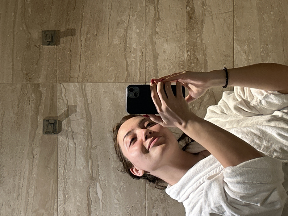 A woman in a white robe takes a selfie in a bathroom. She is holding a black smartphone, and her red-painted nails are visible. She has light skin and is smiling slightly. The bathroom features beige tiled walls, with shadows cast by the sunlight. Towel racks are visible on the wall, also casting shadows. The image is taken at an angle, making the scene appear sideways.