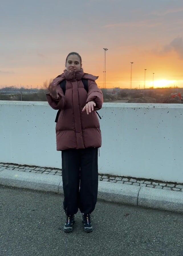 A woman wearing a maroon puffer jacket, black pants, and a black backpack is standing on a gray paved surface in front of a light gray concrete barrier. She is making hand motions, clapping, and smiling at the camera. Behind the barrier, there is a construction site with piles of dirt and an orange excavator. In the distance, there are several tall light poles. The sky is a mix of orange, pink, and gray, indicating a sunrise or sunset.