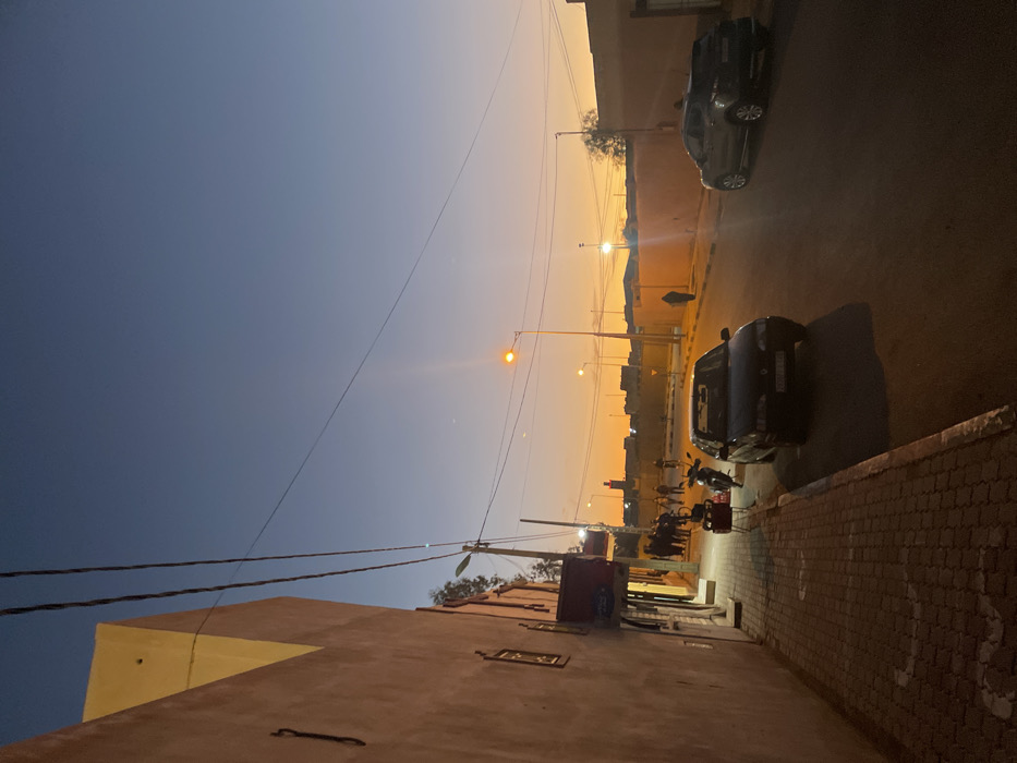 A street scene at dusk with a sky gradation from blue to orange. Cars line the side of the road. Streetlights illuminate the area. Buildings on either side cast shadows. People and a motorcycle are visible in the distance. Overhead wires crisscross the sky. The walls are brick and light-colored stone.