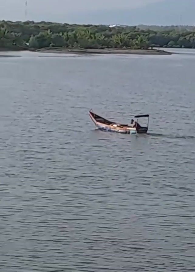 small, motorized boat moving across a body of water. The boat has a curved, red-trimmed bow and a small, dark-colored canopy or sunshade towards the stern. A single person is visible sitting near the back of the boat, presumably operating it. The water is somewhat choppy, with small waves creating texture on the surface. In the background, there's a strip of land covered in green vegetation, possibly trees or shrubs. In the far distance, a few structures or towers are faintly visible against the overcast sky.