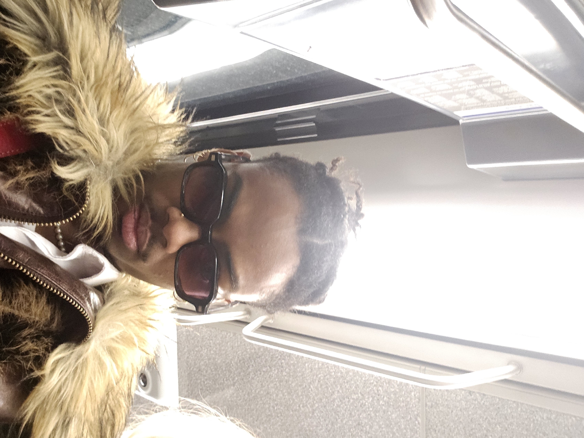 A person is sitting on a train, facing the camera, and wearing a brown fur-lined jacket and sunglasses