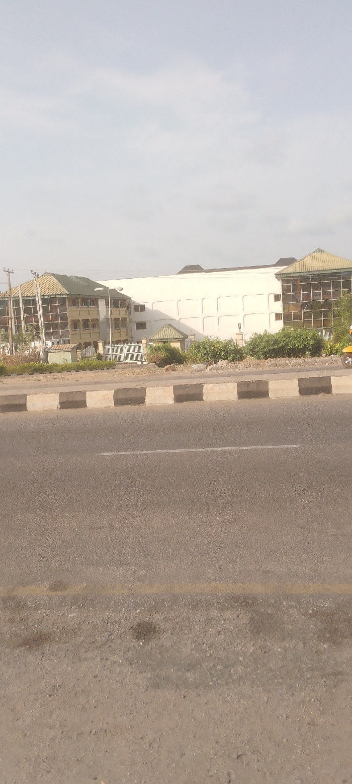 The image depicts a multi-story building complex situated along a paved road in Adankolo, Nigeria, under an overcast sky. In the foreground, a two-lane asphalt road runs horizontally, marked by a faint white centerline and a partially visible yellow shoulder line. A concrete median with alternating light and dark grey blocks separates the road from the property. Beyond the median, an unpaved strip contains sparse vegetation and green shrubs. The building complex itself features multiple structures. To the left, a light-colored, multi-story building with numerous large, reflective glass windows and a green hip roof is visible. Adjacent to it, a large, predominantly white building with a modern, block-like facade featuring rectangular recesses dominates the center. To the right, another section of the complex displays similar large, reflective windows and a green hip roof. A white gate, flanked by two small structures with green roofs, serves as the main entrance. A streetlamp is positioned near the gate. A utility pole stands on the far left. A small yellow vehicle is partially visible on the far right. No individuals or specific activities are discernible.