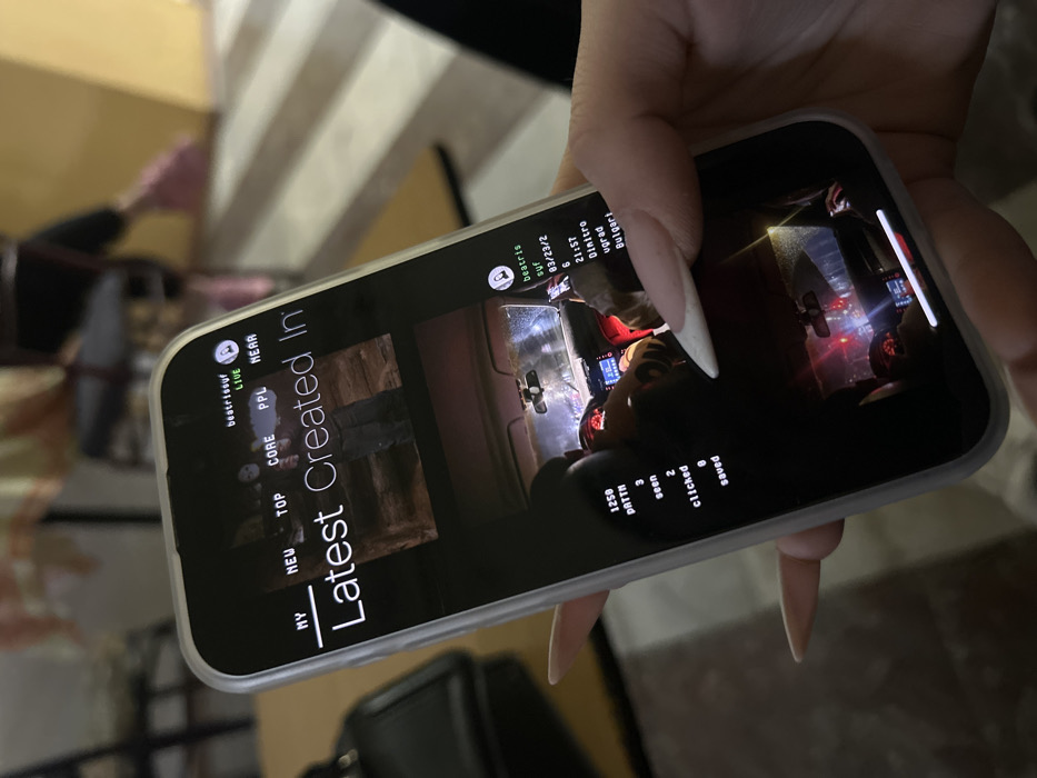 A human hand with long, pointed, French-manicured fingernails holds a smartphone, which is the central focus of the image. The smartphone is encased in a clear protective cover and displays an active application interface. The screen features navigation tabs at the top, including "MY," "NEW," "TOP," "CORE," "PPL," and "NEAR," with "MY" underlined as the active tab. Below these, the heading "Latest Created In" is visible. The primary content displayed is a preview of a vehicle's interior at night, viewed from the rear looking forward through a windshield covered in water droplets. Reflections of external red and white lights are visible on the wet glass and dashboard. Two individuals occupy the front seats of the vehicle. Overlaid text on this preview provides specific metadata: a username "beatrismf," the date "03/23/22," the time "21:57," and the explicit location "**Dimitrovgrad, Bulgaria**." Further metrics are displayed on the lower left of the preview, stating "1250 PATH," "3 seen," "2 clicked," and "0 saved." The background beyond the hand and phone is out of focus, indicating an indoor environment with muted colors, featuring indistinct shapes consistent with furniture or walls, and a dark object, possibly a bag, on a surface to the left.