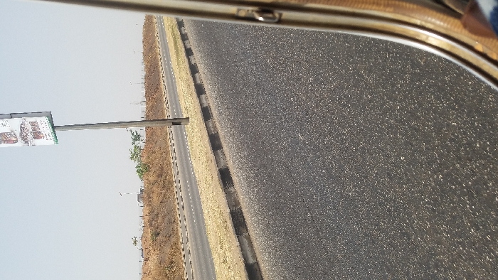 The image depicts an outdoor roadside scene in Aso, Nigeria. The foreground is dominated by a dark gray asphalt road surface. To the immediate right, a concrete curb is visible, painted with alternating black and off-white segments, some appearing worn. Beyond the curb, a narrow strip of dry, light brown soil separates the foreground road from a parallel paved road lane. This second lane features a solid white line on its outer edge and dashed white lines forming an inner boundary. Between the two road sections, a wide, unpaved median consists of dry, reddish-brown soil. Within this median, multiple rows of horizontally placed, partially buried vehicle tires form a low barrier. A tall, dark utility pole stands upright in the median, supporting a rectangular billboard. The billboard displays several product images, resembling packaged goods or food, with partially legible text below them, including "DRM 1-1-22." In the background, a low, undulating earth bank of dry, reddish-brown soil rises, sparsely covered with small green bushes and trees. The distant horizon shows faint, indistinct structures or vehicles. The sky is a clear, light gray-blue, indicative of a bright, possibly hazy, day. No human figures or active interactions are discernible within the frame. The image is captured from a slightly elevated perspective, likely from inside a vehicle, with part of its metallic window frame visible along the right edge.