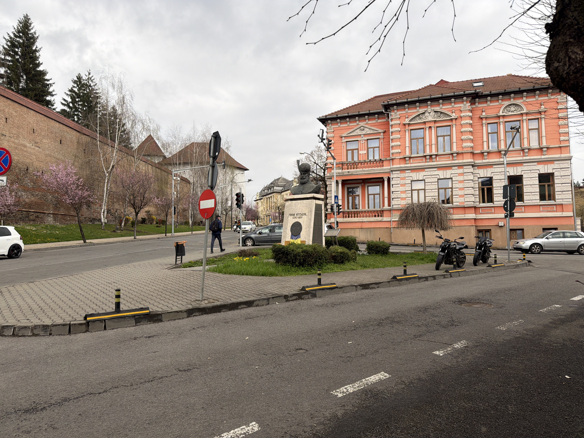 This image depicts a street in Târgu Mureș, Romania, on an overcast day. The main foreground features a paved roadway with pedestrian crosswalk markings. In the central view, there is a circular section of cobblestone sidewalk with a small, landscaped area containing a statue of Mihai Viteazul (1593-1601), a historical figure. Two motorcycles are parked along the curb. A pedestrian is crossing the street, and several cars are visible in the background. Adjacent to the street, a building with an ornate, peach-colored facade stands to the right, and part of a brick wall can be seen on the left. A traffic signal with a 'no entry' sign is also present.