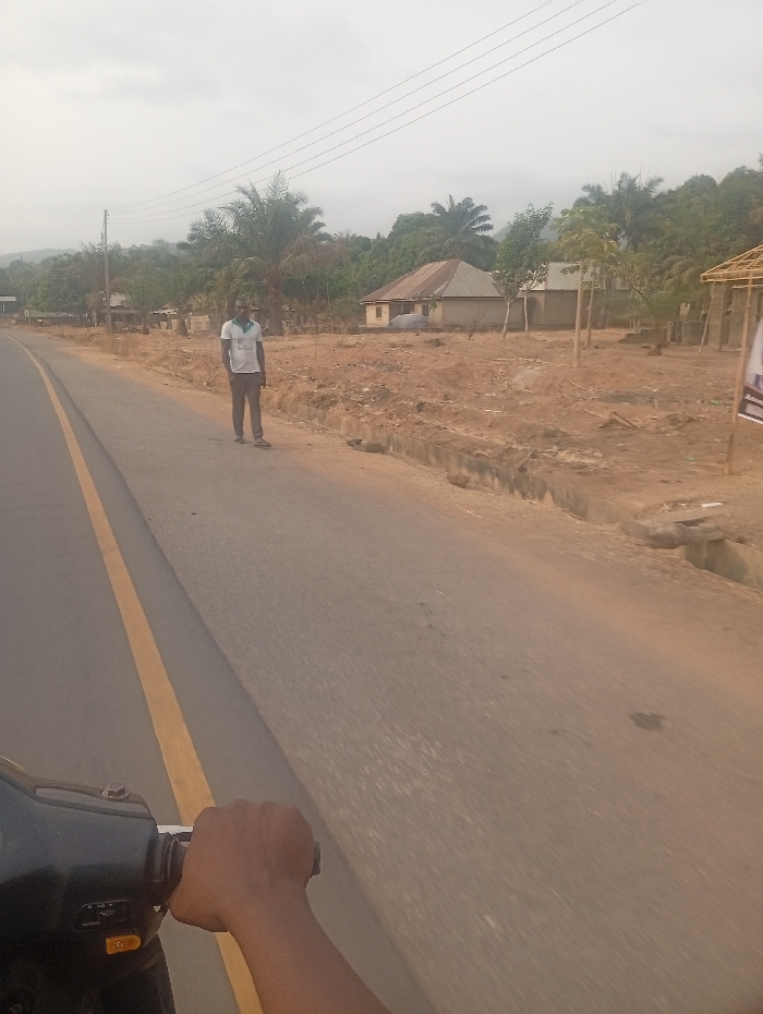 The scene is a paved road with a yellow dividing line. A person is driving a motorcycle on the road. The person's right hand is visible on the handlebars. The road is empty except for a man in a white shirt and blue jeans standing on the right side of the road. There are a few houses and palm trees on the right side of the road. The sky is overcast with clouds. The location of the image is Vana, Nigeria, at latitude 8.837 and longitude 8.452.