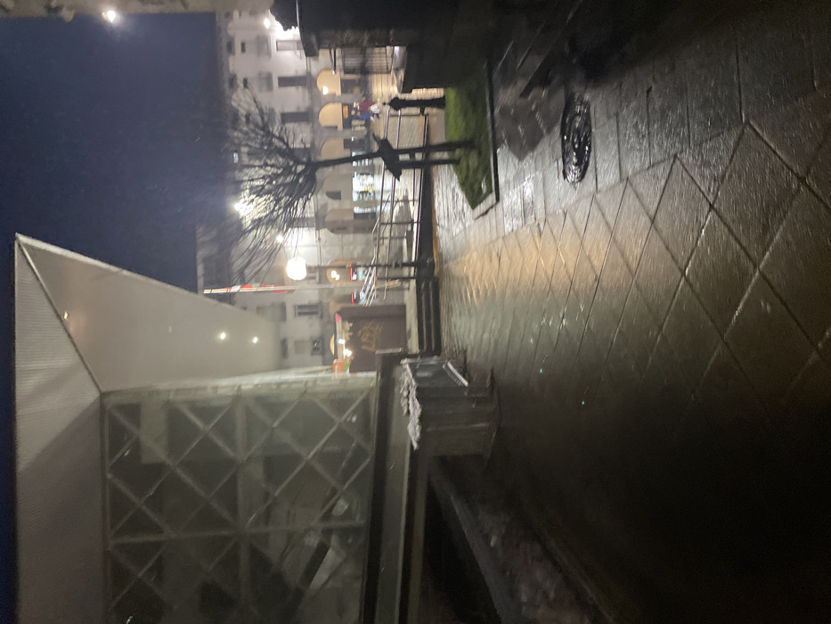 A nighttime street view features a building with a distinctive triangular roof and glass façade. Across the street, other buildings exhibit arches and lights. A bare tree stands on the sidewalk, and wet pavement reflects the ambient light, displaying a diamond-patterned texture. The scene appears urban, with a blend of modern and classical architecture.