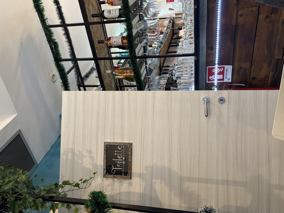 The scene depicts an indoor area of a commercial establishment, likely a restaurant or bar, located in Ferrara, Italy. The environment is adorned with festive green tinsel decorations. On the left side of the frame, a light-colored, horizontally-grained wooden door is partially visible, featuring a silver-colored handle and a keyhole with a silver escutcheon plate. Centered on the upper half of the door is a rectangular, dark-colored sign with a distressed wooden frame, bearing the word "Toilette" in elegant white script. To the far left, artificial green ivy is draped over a vertical black structural element, which also features small clusters of green tinsel. The upper left ceiling area above the door consists of a white surface, a metallic ceiling vent, and a segment of turquoise-painted wall. To the right of the door, a black metal shelving unit, decorated with green tinsel garland along its top and horizontal bars, extends upwards. Its wooden shelves display various bottles, including multiple wine bottles (rose, red, and sparkling varieties are discernible). Below the bottle shelves, numerous clear glass stemware, such as wine glasses and flutes, hang inverted from racks attached to the shelving unit. Additional clear tumblers and other glassware are stacked on lower surfaces, forming part of a bar setup. The bar counter's lower facade consists of dark wooden paneling, above which a horizontal strip of white LED lights is mounted. A white rectangular sign, featuring a red fire extinguisher icon and the Italian text "ESTINTORE", is affixed to the wooden paneling. A portion of a red fire extinguisher is visible directly behind this sign. No individuals are present, and no actions or interactions are depicted.