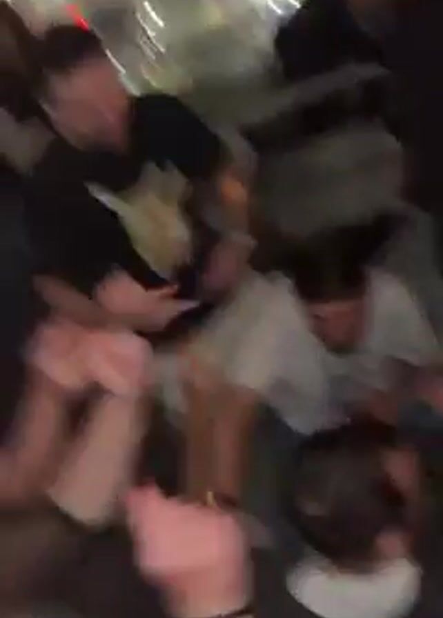 A group of four or more people are gathered indoors, their bodies close together. They are clapping their hands in unison, creating a rhythmic sound. The camera is held at a high angle, giving a partial view of the individuals. The lighting is dim, making it difficult to distinguish fine details. Most of the people are wearing dark clothing, while one person is wearing a light-colored shirt. Their faces show excitement and enjoyment as they clap together.