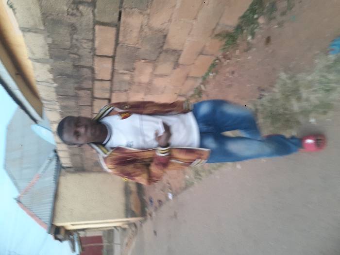 A man stands outdoors on a dusty ground near a brick wall. He's wearing blue jeans, a white t-shirt, and a brown jacket. He also has red shoes on. There's a building behind him with a visible satellite dish. Some greenery is visible near the man.