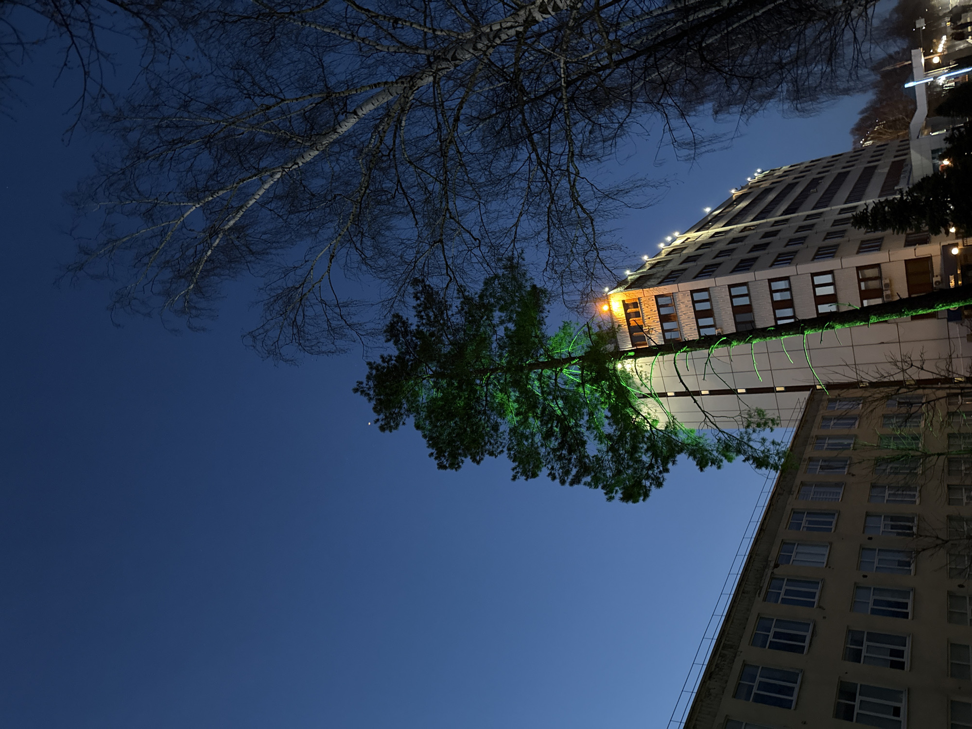 The image, taken in Chaikovsky, Russia, depicts a night scene with a low-angle perspective looking up. The lower portion of the frame is dominated by a deep blue sky. In the upper sections, bare tree branches stretch across the sky, juxtaposed with a modern building facade. The building's architecture suggests a multi-story structure, possibly a residential or office building, illuminated by lights along its upper edge and within individual windows. A tree with dense, green foliage is situated near the building, also appearing to be illuminated with a green light source. The image seems to be captured at dusk or early evening.