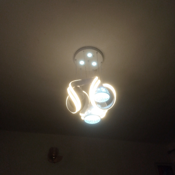 A modern multi-component LED chandelier hangs centrally from a light-colored ceiling in a dimly lit indoor environment in Abakaliki, Nigeria