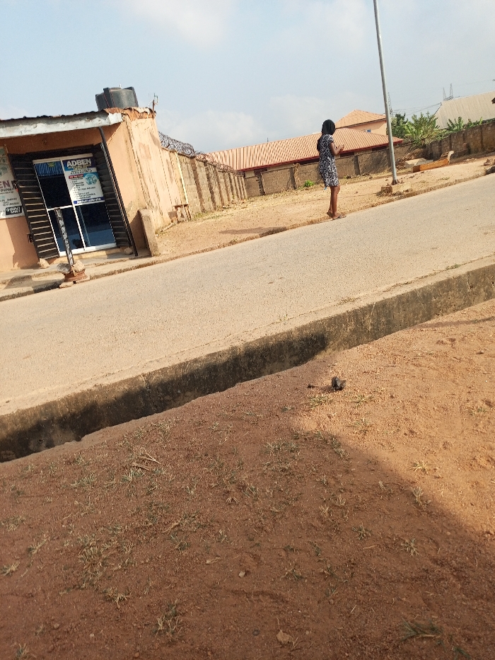 The scene is an outdoor street in Oshogbo, Nigeria, under a partly cloudy sky. A light-colored asphalt road traverses the midground diagonally from left to right. A concrete curb with an adjacent drainage channel, containing dark sediment, lines the road. To the left, a reddish-brown dirt shoulder with sparse grass patches abuts a single-story commercial building. This building, with tan walls, features a dark water tank on its roof and a glass facade displaying "ADBEN GLOBAL BUREAU" and additional text. A small, dark cylindrical object is positioned on the dirt in front of the building's entrance. On the right side of the road, a female subject stands on a similar reddish-brown dirt shoulder. She is dressed in a patterned, knee-length dress and light-colored sandals, actively observing an object held in her hands. A slender grey utility pole stands adjacent to her. Behind the subject and extending left, a concrete wall topped with barbed wire delineates the area from residential structures with reddish-brown corrugated roofs. Sparse debris is visible on the dirt shoulder near the drainage channel.