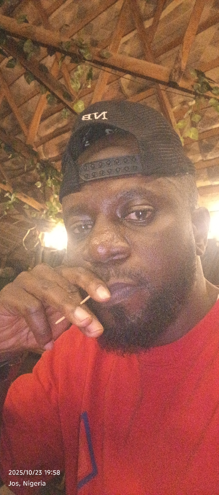 An adult male with dark skin, a full beard, and short dark hair is depicted from the chest up, looking directly into the camera. He wears a dark baseball cap backwards, displaying white embroidered letters "ИВ" (reversed) on the front, and a red shirt with a subtle blue angled design on the lower left. His right hand is raised, holding a small wooden toothpick between his index and middle fingers, positioned near his mouth. The background features an overhead structure of interwoven wooden beams adorned with artificial green foliage, illuminated by a warm light source on the upper left. The image timestamp is 2025/10/23 19:58, and the location is Jos, Nigeria.