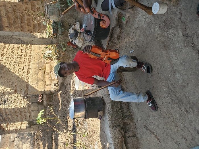 This image captures an outdoor scene in Gwong, Nigeria. A Black male, appearing to be in his late teens or early twenties, is seated centrally on a dark cylindrical stool, facing the viewer with a smile. He wears a green baseball cap, a red t-shirt, light blue jeans, and dark slides with "FILA" branding. He holds a light-brown violin in his left hand, resting on his lap, and a violin bow in his right hand. To his immediate right, a portion of a second individual's hand is visible, holding the scroll and neck of another similar string instrument. The ground is composed of uneven, light-colored packed dirt or sand with visible cracks. In the left background, a silver metal pot with a lid sits on a dark, cylindrical metal stove. Behind the seated individual, a white plastic bucket is visible on the left, and a black plastic bucket with a lid is on the right. A small black bag, possibly an instrument case, lies on the ground to the right of the seated individual, near a small white cylindrical container with a lid. The background consists of unplastered, light-brown mud-brick or concrete block walls, forming parts of what appears to be an incomplete or dilapidated structure. Sparse dry vegetation and small green plants grow in the immediate vicinity of these walls. The scene is brightly illuminated by natural sunlight, casting distinct shadows on the ground and structures.
