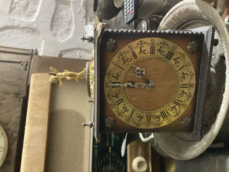 This image depicts an indoor scene, likely a vintage shop or private collection, within the city of Tanger, Morocco. The central focus is an antique square mantel clock crafted from dark wood with a lighter wooden face, featuring Roman numerals for hours (I-XII) and Arabic numerals for minutes (0-60). The clock's hands indicate approximately 1:59. The clock's upper edge exhibits damage on the right side. Perched on the top center of the clock is a small, golden figurine of a cherub or putto, standing on an ornate base. To the right of the cherub, a small white feather is visible next to a decorative finial. A similar finial is present on the left side of the clock's top. The clock itself rests inside a large, ornate, fluted metal basin or bowl, possibly made of pewter or aluminum. Behind the clock, a vintage radio with a cream-colored grille and a dark brown wooden casing is visible. To the far right, a rough, white-painted stone or brick wall forms the background. In the foreground, to the right of the clock, a black television remote control with a prominent red button is partially visible. Further right and behind the remote, a dark, rounded ceramic or clay pot is present. To the left and slightly behind the clock, a small, light-colored ceramic cup or pot is also discernible. No individuals are present in the scene.