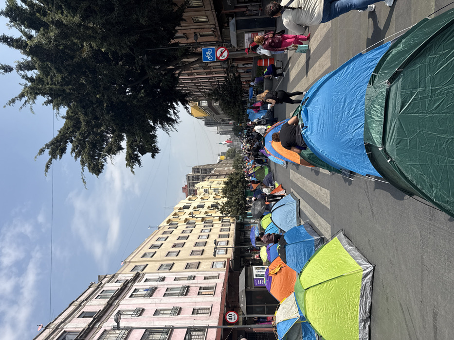This forensic image captures a crowded urban street scene in Mexico City, Mexico, characterized by a large-scale tent encampment