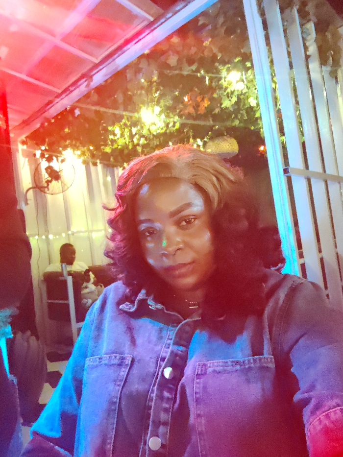 A woman poses for a selfie in an outdoor setting. She has shoulder-length wavy black hair with a brown tint and wears a denim shirt. The background is lit with colorful lights and foliage, suggesting a restaurant or bar. A metal fan and other people are visible in the dimly lit areas behind her. The overall image has a vibrant and festive atmosphere.