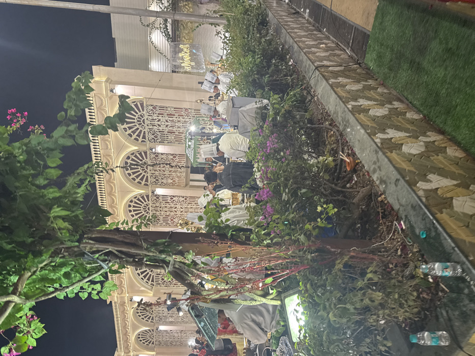 Outdoor night scene featuring a gathering of people, seemingly at an event or celebration. They are seated at tables with white tablecloths. Decorative architecture is visible, adorned with lights and ornate detailing. Lush greenery, including trees and flowers, surrounds the gathering area. Water bottles are scattered around the base of the vegetation.