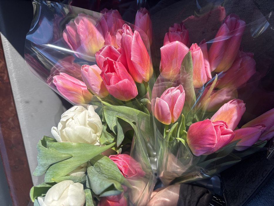 The image displays multiple bouquets of tulips held within the interior of a vehicle, in Pisochyn, Ukraine