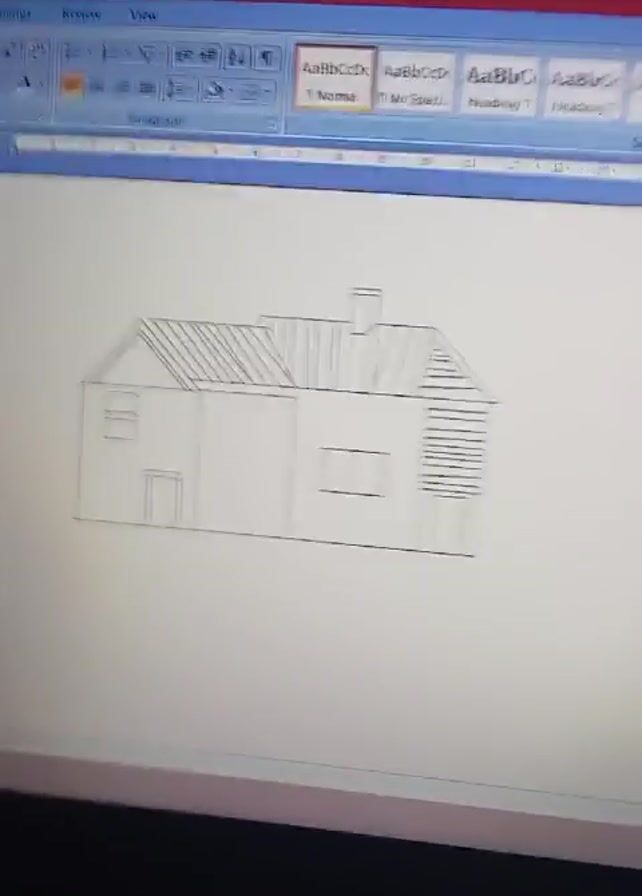 computer screen displaying a black and white line drawing of a house in Microsoft Word