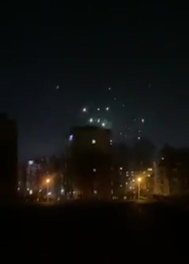 fireworks at night over a cityscape. The sky is dark. There are a few buildings in the foreground, silhouetted against the night sky. There are several streetlights visible. Fireworks explode in the sky, displaying bursts of light. The camera is static.