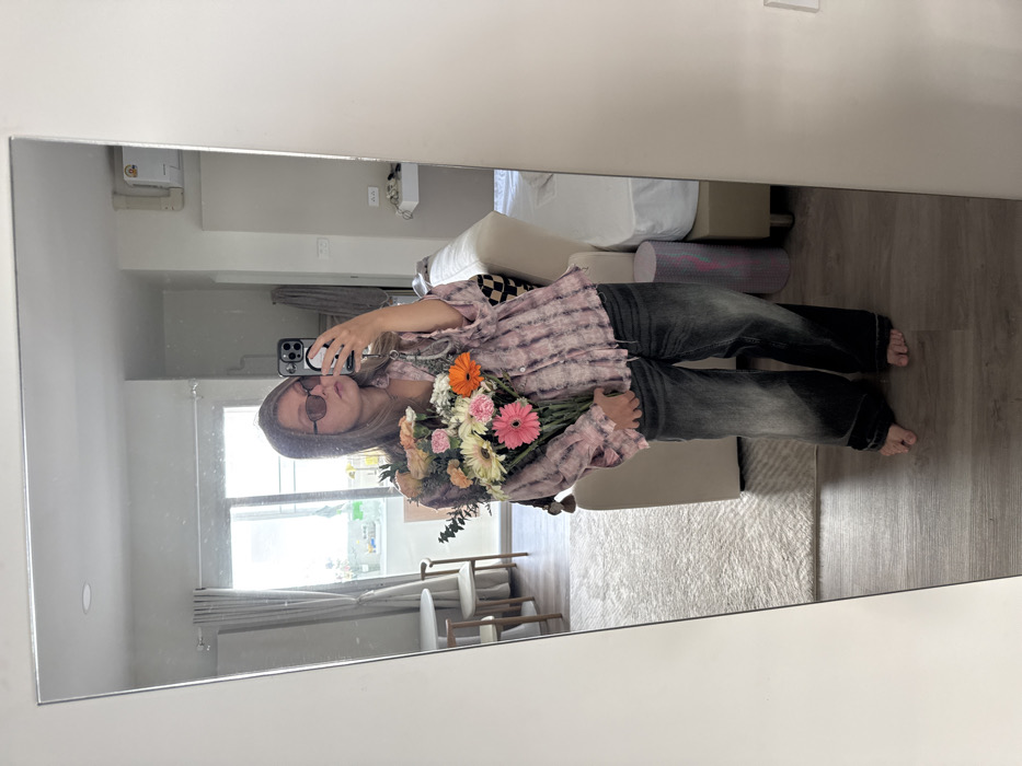 A mirror selfie captures a woman with long hair, wearing sunglasses, a tie-dye shirt, and jeans. She's holding a large bouquet of colorful flowers. The reflection reveals a bright interior with a window, chairs, and a partially visible bed. The composition includes a glimpse of the room's neutral color palette and soft furnishings.