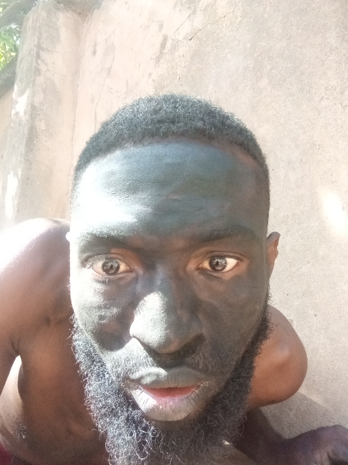 A close-up photograph shows an adult male located in Sabon Tasha, Nigeria. His face, from the forehead to the chin, is uniformly coated with a dark gray or black particulate substance, possibly powder or clay. He has short, dark, curly hair and a thick, dark beard. His eyes are open, with dark irises, and he is looking directly at the camera. His lips are slightly parted and appear reddish. Portions of his bare shoulders are visible in the lower left and right foreground. The background consists of a textured, light beige or tan wall, which shows some minor cracks and discoloration. A faint hint of green foliage or shadow is visible in the upper left corner of the frame. Strong overhead lighting illuminates the scene, casting subtle shadows on the subject's face.