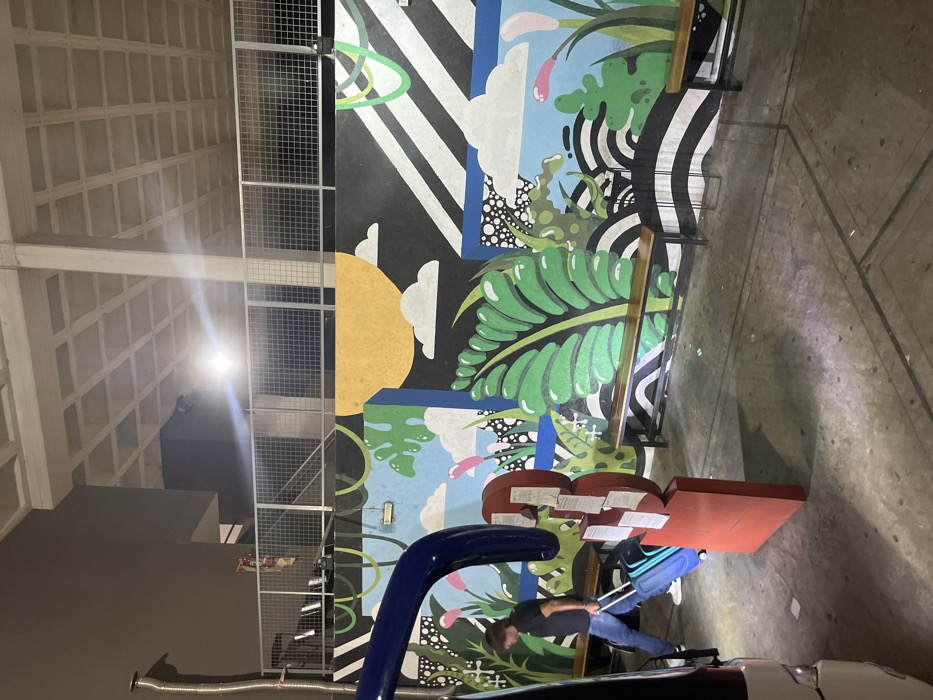 A man pulls a blue suitcase alongside a mural featuring vibrant flora, a yellow sun, and abstract geometric shapes. Nearby, a red structure with papers is visible. The background showcases a textured concrete wall and a ceiling with a grid-like pattern. A car with visible exhaust pipe is on the bottom of the frame. The image is taken at night with artificial lighting.
