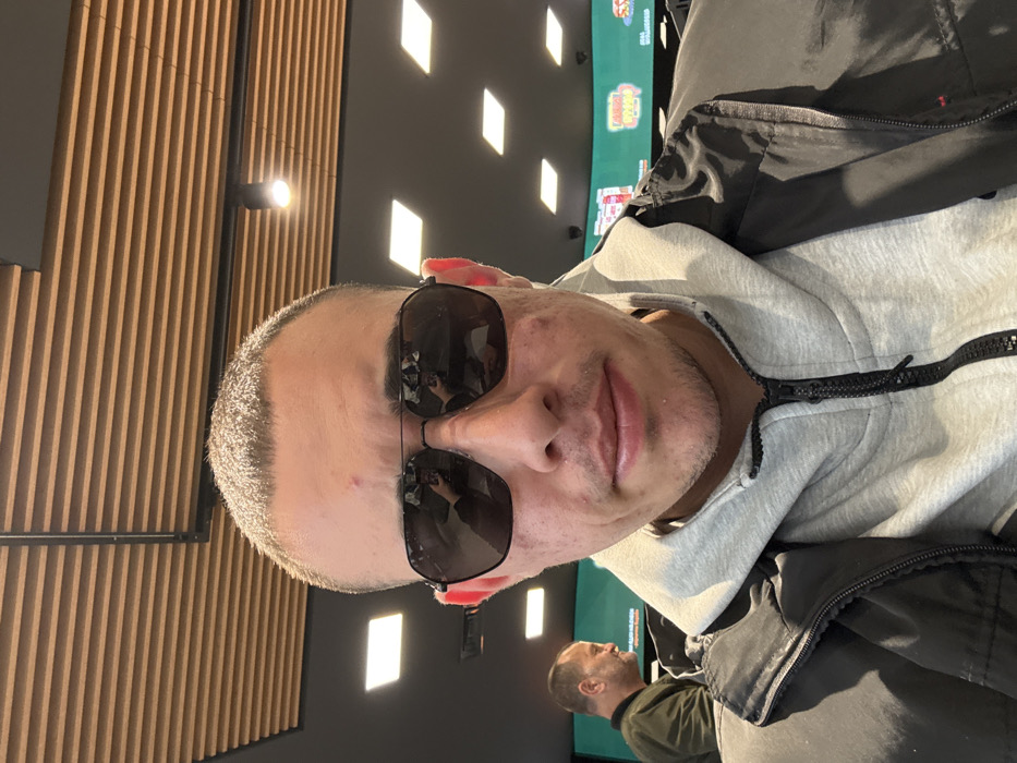 The scene depicts a male individual in the foreground, centered, looking directly at the camera, consistent with a selfie