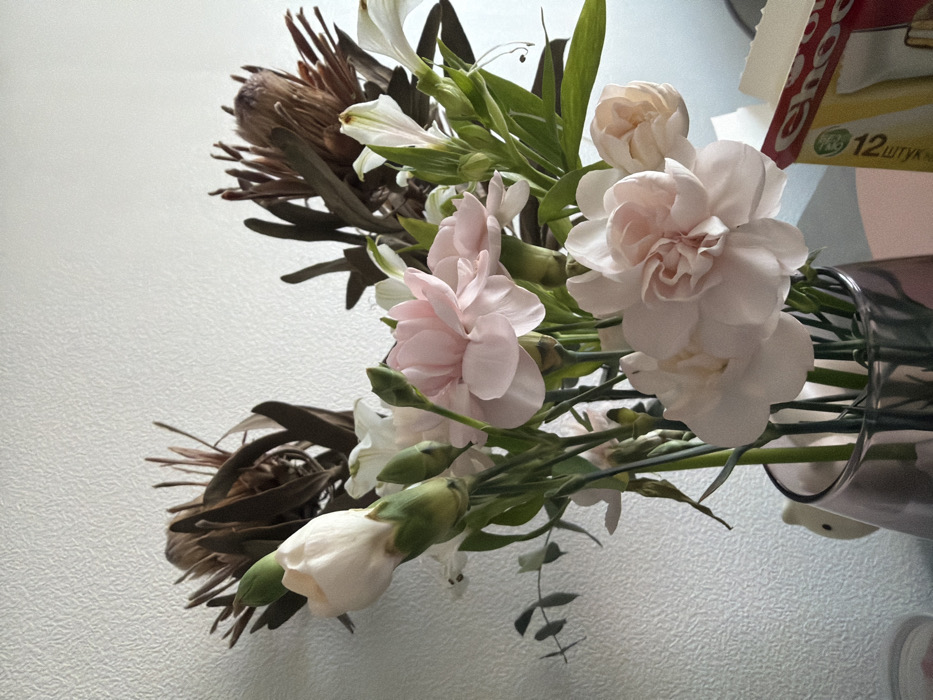 The image displays a static indoor scene in Yanino-1, Russia, featuring a floral arrangement. A bouquet of cut flowers is contained within a translucent, purplish-gray glass vase positioned in the foreground. The bouquet consists predominantly of light pink carnations, some fully bloomed and others as buds, interspersed with white alstroemeria or similar lily-like flowers and green foliage. Several large, dried, brown, spiky flower heads, resembling protea, are visible in the background of the arrangement, adding a contrasting texture and color. The immediate background consists of a textured, light-colored wall. To the lower right, a portion of a light-colored cardboard box is visible, featuring red and white text, including "Choco" and "12 ШТУК" (12 pieces), suggesting a confectionery or food product. A small, white, rounded object is partially obscured behind the vase on the lower left. No individuals or active events are depicted.