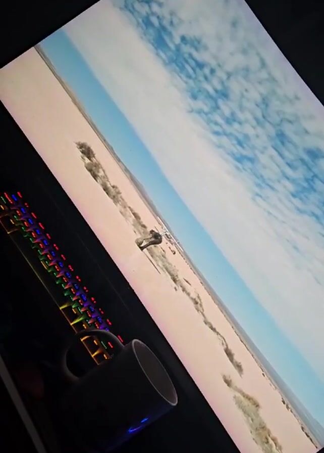 The scene shows a monitor angled to the left, displaying a desert landscape under a partly cloudy sky