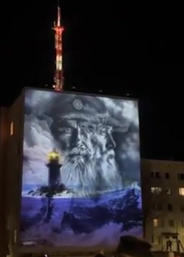 At night, a building is illuminated with a mural depicting two seafarers against a turbulent sea, with a lighthouse. A tall, red-and-white radio tower rises above the building. People stand in the foreground, observing the mural. A car is parked near the crowd. Other buildings can be seen to the side, under the night sky.