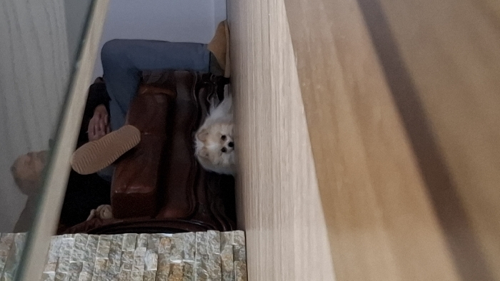 A tan Pomeranian peers from behind a wooden cabinet, next to a person wearing blue jeans and tan shoes resting on a dark brown wooden pedestal